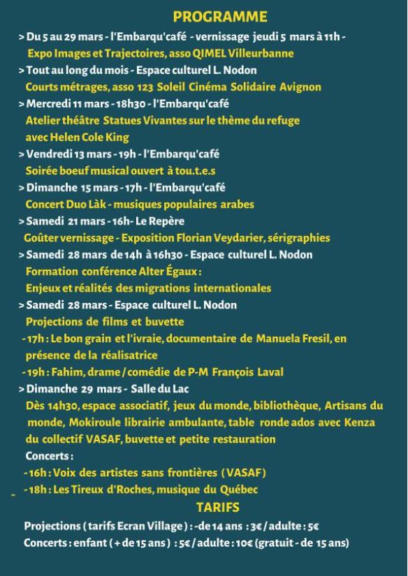 Une restauration sera possible sur place, une inscription est préférable pour les ateliers bolas et une participation au chapeau est demandée pour les artistes.